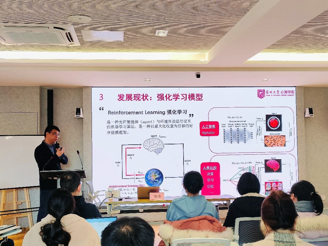 陈琦教授长期致力于建立心理认知过程的计算模型,特别聚焦于强化学习与认知的计算模型的构建和计算精神病学。在本次讲座中,陈教授从认知心理的传统研究范式引入,逐步带领师生了解人类认知过程的计算建模方法的发展、演变以及应用。他在讲座中详细分享了常见的几类认知过程的计算模型,如强化学习模型和神经网络模型,以及团队的最新研究成果,并讨论这些研究成果对于理解人类认知机制的意义和影响。最后,陈老师和大家分享了这个领域最新研究进展以及未来发展方向。