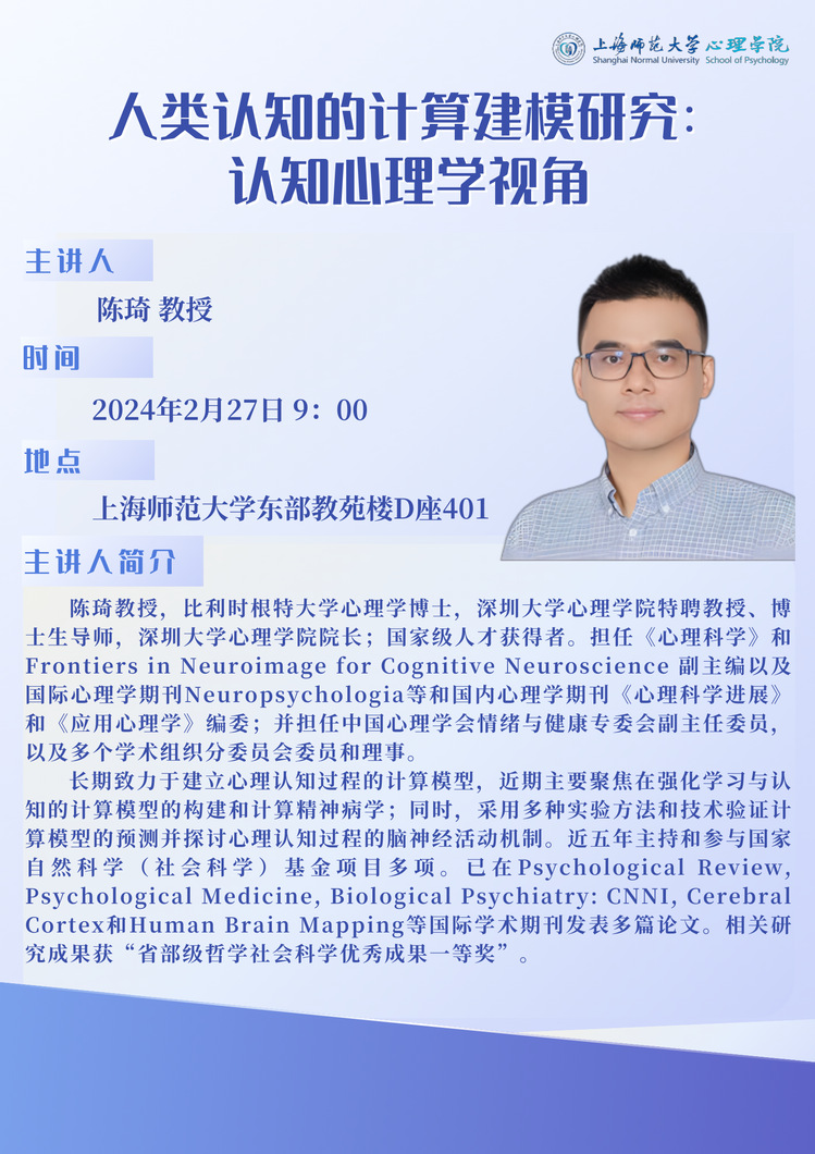 深圳大学yl23411永利集团官网陈琦教授“人类认知的计算建模研究:认知心理学视角”