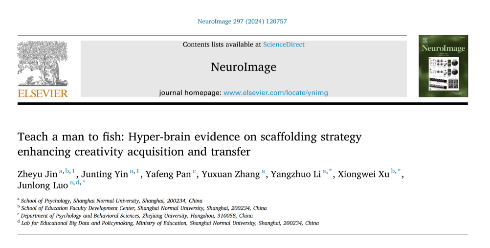 Jin, Z., Yin, J., Pan, Y., Zhang, Y., Li, Y., Xu, X., & Luo, J. (2024). Teach a man to fish: Hyper-brain evidence on scaffolding strategy enhancing creativity acquisition and transfer. NeuroImage, 297, 120757.