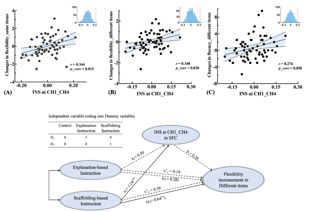值得注意的是,我们还在支架教学组的左上额叶皮层观察到了指导者和学习者之间显著的脑间神经同步(INS),而在解释组和对照组则没有出现。此外,INS 对创造力表现(习得和迁移)的提高具有正向预测作用,表明它是创造力培养过程中的一个重要神经机制。