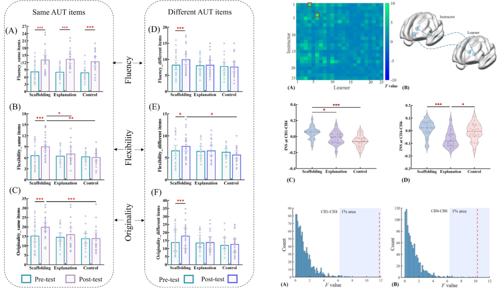 为此,研究团队在自然实验室环境中,随机将66对师生分为三组(支架式组、解释式组和对照组),分别进行发散思维教学。通过功能性近红外光谱脑超扫描技术(fNIRS hyperscanning),同时收集了前额叶和颞顶联合区的脑信号。结果表明,接受支架策略指导后的学习者在创造技能的习得(直接学习)和迁移(在新情境中使用)方面都表现出更出色的创造力。相比之下,对照组和解释组则没有表现出这种效果。