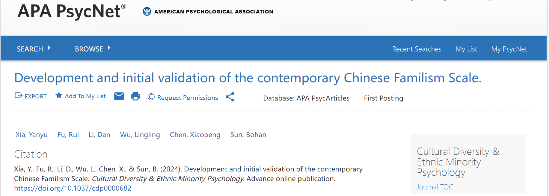 Xia, Y., Fu, R., Li, D., Wu, L., Chen, X., & Sun, B. (2024). Development and initial validation of the contemporary Chinese Familism Scale. Cultural Diversity & Ethnic Minority Psychology. Advance online publication.