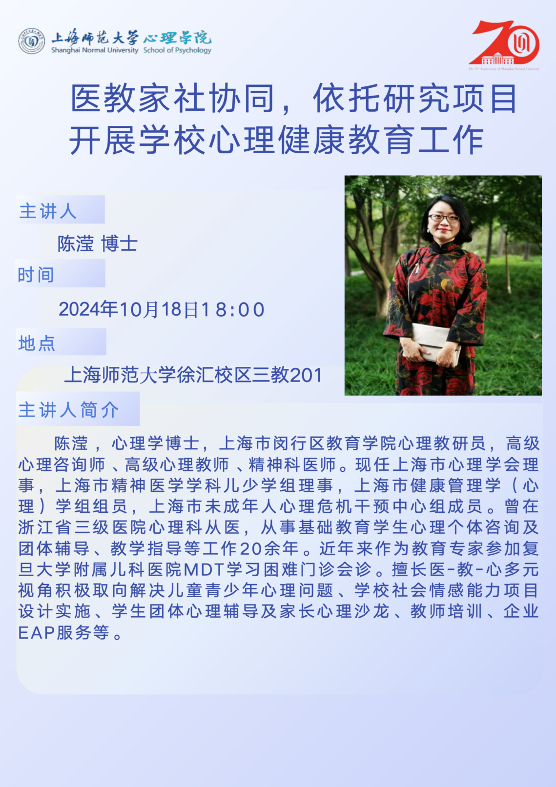 2024年10月18日下午,在yl23411永利集团官网70周年校庆之际,闵行区教育学院心理教研员陈滢博士应邀为永利集团官网师生作《医教家社协同,依托项目研究开展学校心理健康教育工作》的主题讲座,讲座由王怀勇副教授主持,40余位师生参加讲座并与陈滢博士进行了交流互动。