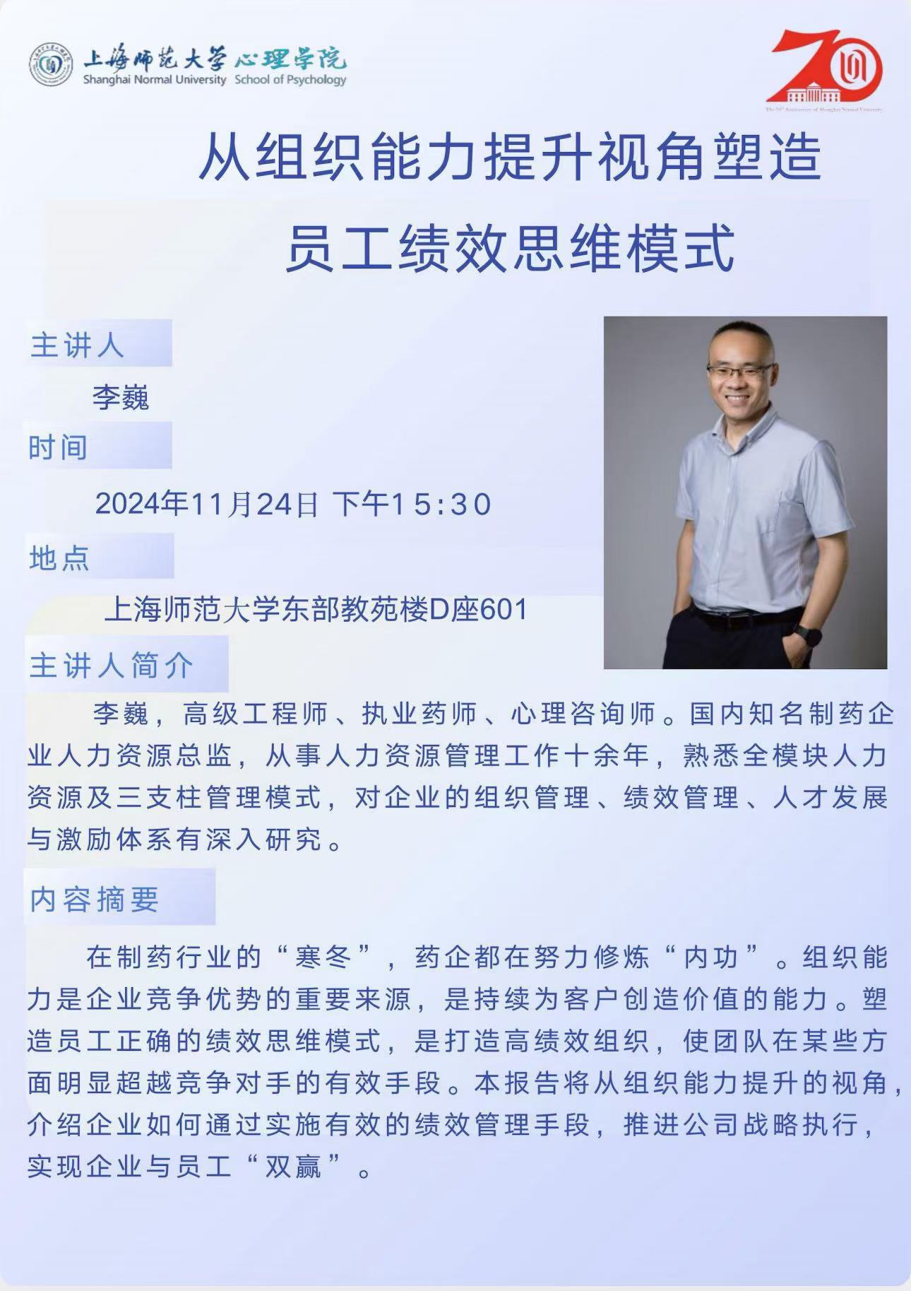 2024年11月24日,先声药业人力资源总监李巍应邀为永利集团官网研究生作《塑造员工绩效思维模式:从组织能力提升视角看企业绩效管理》的专题讲座,讲座由永利集团官网王怀勇副教授主持。
