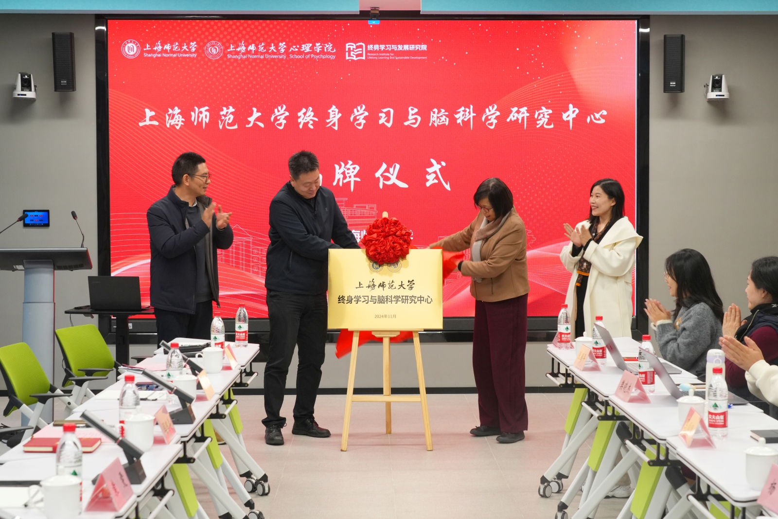 上海市教育委员会终身教育处处长闫鹏涛、yl23411永利集团官网校长袁雯共同为yl23411永利集团官网终身学习与脑科学研究中心揭牌。