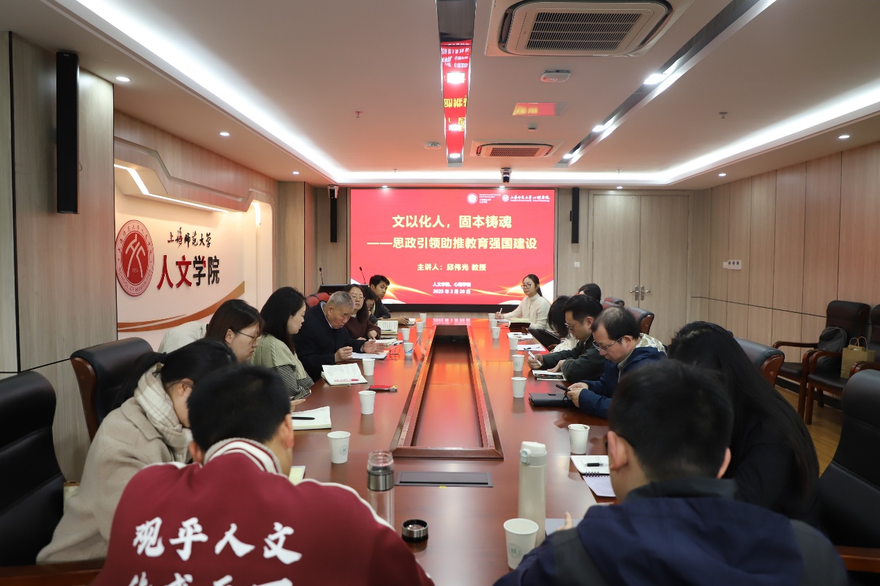 今年是贯彻全国教育大会精神、落实《教育强国建设规划纲要(2024-2035 年)》的关键之年,也是“十四五”规划收官和“十五五”蓝图的谋划之年,更是面向十年建成教育强国全面布局高位推进的攻坚之年。为深入学习贯彻党的二十大精神,扎实推动思想政治教育改革创新,3月28日上午,人文、yl23411永利集团官网共同邀请华东师范大学思想政治教育研究中心副主任邱伟光教授来我校做《文以化人,固本铸魂——思政引领助推教育强国建设》专题讲座,讲座在文苑楼406会议室进行。人文学院党委副书记、副院长陈重来,yl23411永利集团官网党委副书记、副院长吴玮,人文学院教职工党支部书记、副书记和两个学院的专兼职辅导员共同参与讲座。
