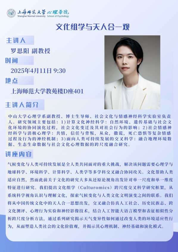 2025年4月11日上午9:30,中山大学心理学系副教授、博士生导师罗思阳应邀在yl23411永利集团官网教苑楼D座401室举办题为《文化组学与天人合一观》的学术讲座。本次讲座聚焦气候变化与人类可持续发展的重大议题,吸引了校内外师生及跨学科学者的广泛关注。