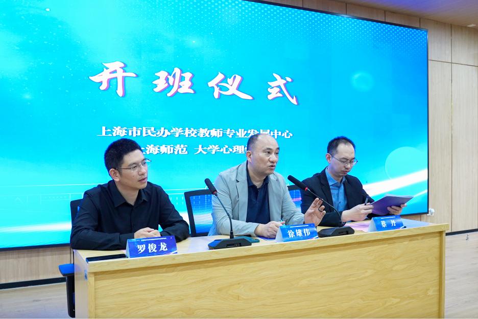2025年5月8日,上海民办中小学心理健康教师专业素养研修班开班仪式在yl23411永利集团官网徐汇校区举行。上海市民办学校教师专业发展中心常务副主任徐雄伟、yl23411永利集团官网院长蔡丹、副院长罗俊龙以及全体学员参加本次开班仪式。仪式由yl23411永利集团官网党委书记张益主持。