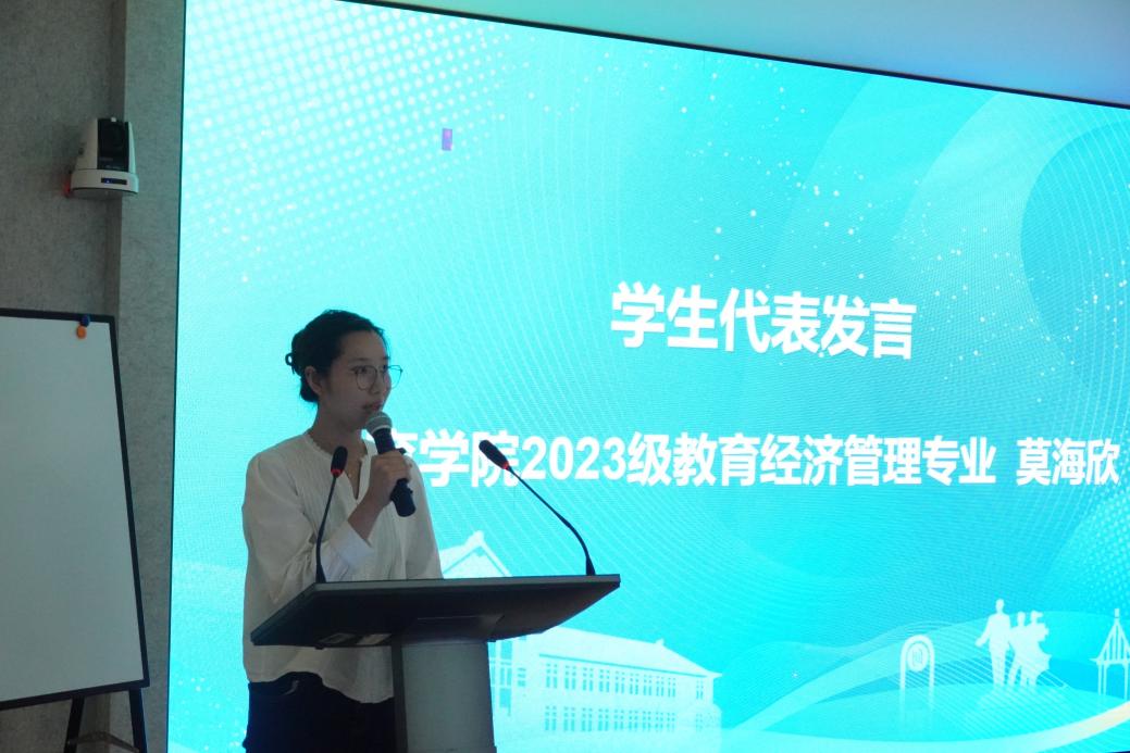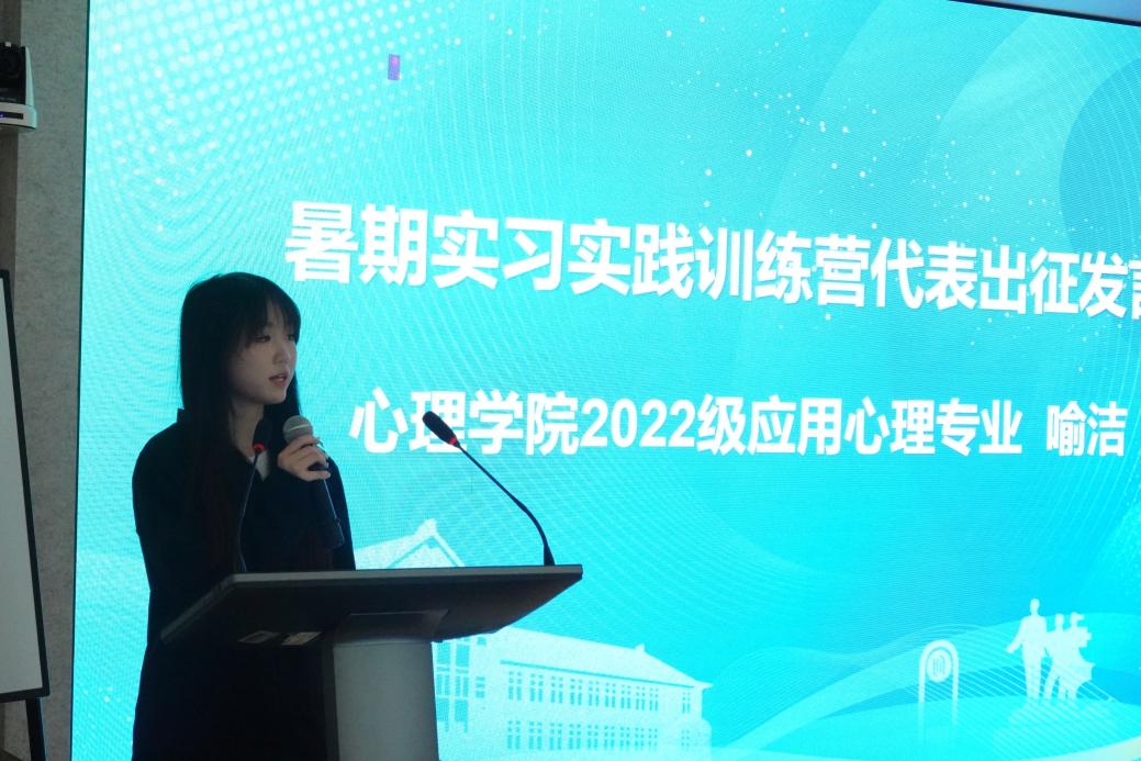 教育学院教育经济管理专业莫海欣作为学生代表上台发言,分享了自己在过往实习中的宝贵经历。她提到,作为即将踏入职场的学生,她深刻认识到理论与实践相结合的重要性,并期待通过暑期实习实践训练营,进一步提升自己的专业技能和职业素养,为未来的职业发展打下坚实基础。