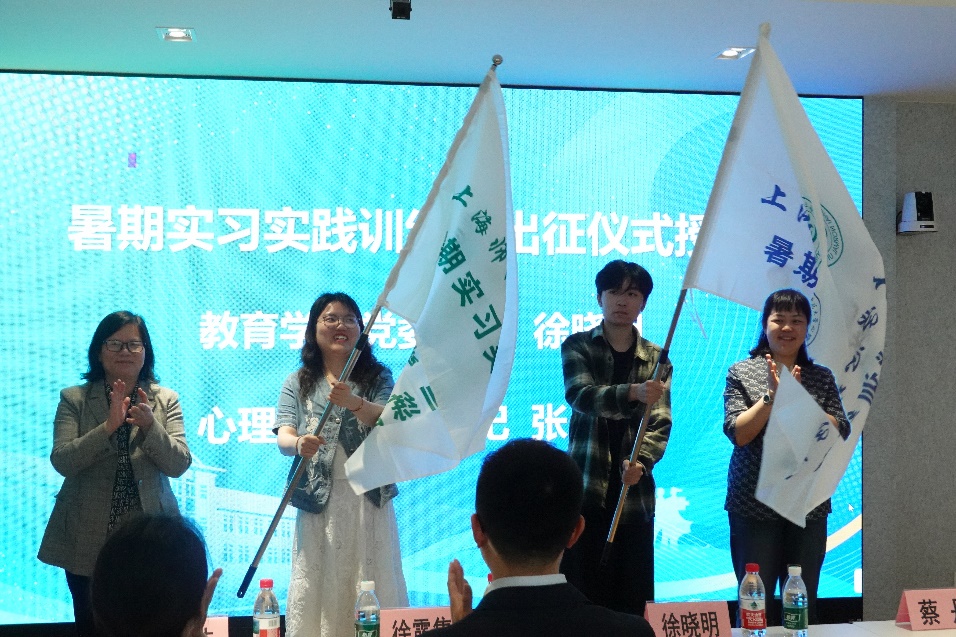 仪式上,教育学院党委书记徐晓明、yl23411永利集团官网党委书记张益为暑期实习实践训练营代表授旗,yl23411永利集团官网应用心理专业喻洁作为即将踏上实习岗位的学生代表发表出征宣言,展现了青年学子投身实践、锤炼本领的决心。