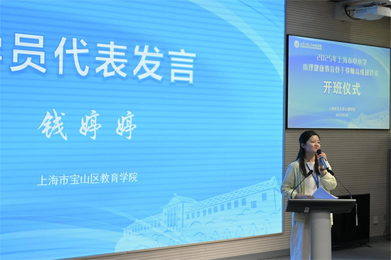来自宝山区教育学院的心理教研员钱婷婷和松江区九亭中学的骨干教师方小江作为学生代表发言。钱婷婷作为师大校友和往届学员代表,从专业发展和实践需求两个维度深入剖析了研修班的重要意义。她认为,高研班始终紧跟教育改革发展步伐,课程内容持续更新优化,专家团队既具有深厚的理论功底,又植根于基础教育实际,能够为学员提供切实可行的专业指导。方小江则结合自身工作实践,分享了在开展心理干预过程中遇到的困惑与挑战。她表示,本次研修班聚焦人工智能技术应用、医教协同机制等前沿领域,为破解工作中的现实难题提供了全新视角,期待通过与专家深入交流、与同行充分研讨,共同探索新时代中小学心理健康教育工作的新路径、新方向。