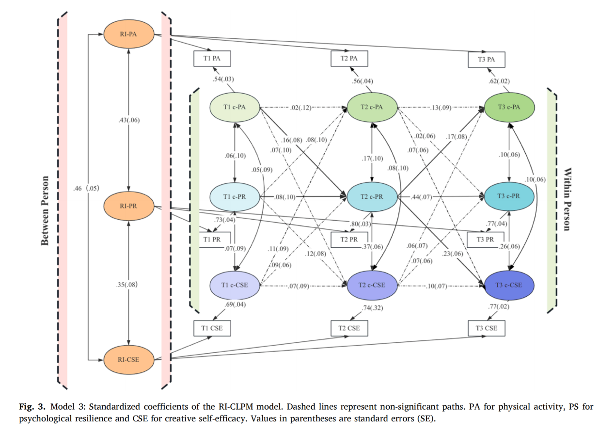创造力是一种关键能力,对于个人和社会的进步不可或缺,培养学生的创造力是素质教育的目标之一。具身认知理论认为,身体与心理之间存在紧密联系,且已有研究证据表明,体育活动对身心健康有益。然而,体育锻炼与创造性自我效能感之间的关系仍未得到充分探讨。为此,本研究采用纵向追踪设计,探讨青少年体育锻炼与创造性自我效能感之间的关系,尤其关注心理韧性的中介作用。研究采用随机截距的交叉滞后模型( RI-CLPM )区分随时间变化的人际间的影响和个体内的影响。结果表明,体育锻炼水平较高的青少年随着时间的推移表现出更强的创造性自我效能感。更值得注意的是,在个体内部层面,体育锻炼增多的青少年的心理韧性会随之增强,并伴随着更高的创造性自我效能感。