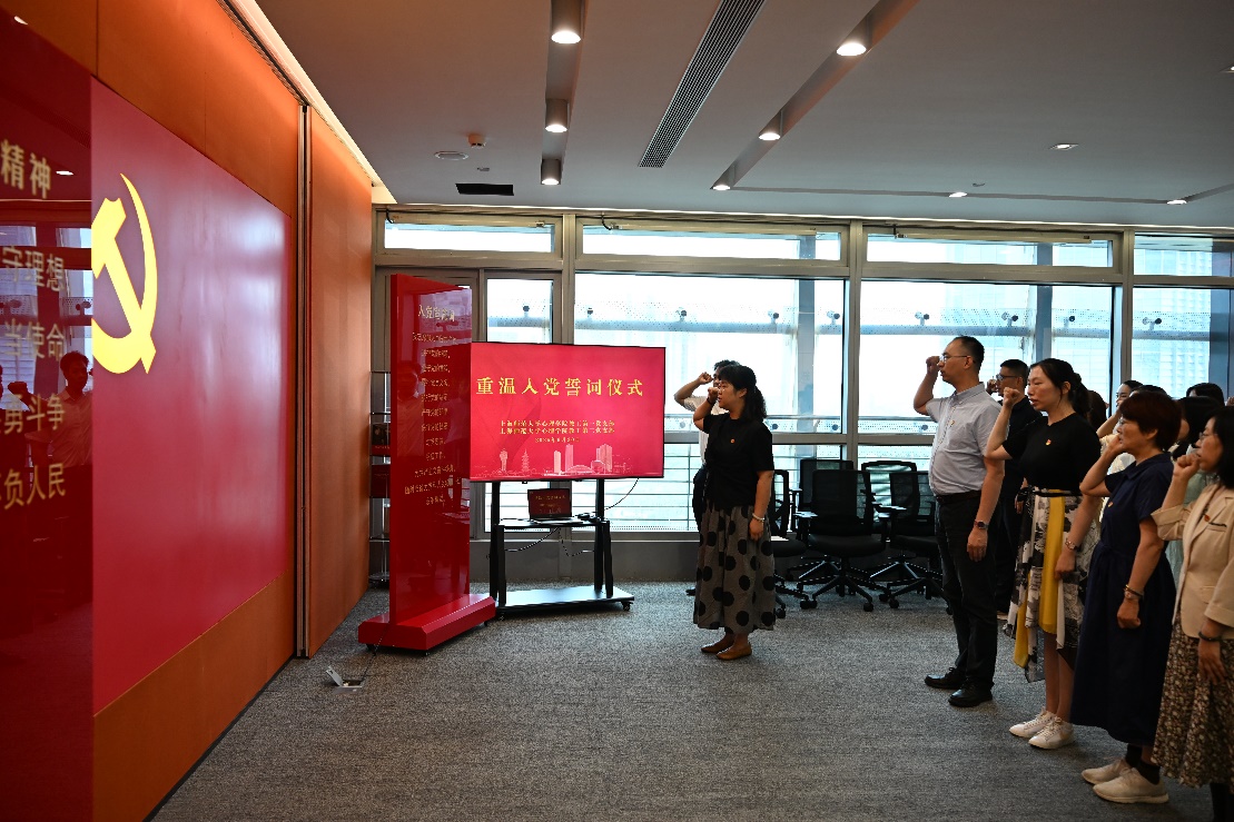 面对党旗,全体党员庄严宣誓,铿锵誓言传递出为共产主义奋斗终身的决心。随后,党员们通过馆藏的1500余张照片、400余件实物、百余件油画等各种艺术品,详细了解了上海地区共产党组织创立、发展、壮大的过程,深切体悟中国共产党的创业艰辛和中国共产党先驱者孕育和奠基的伟大建党精神。