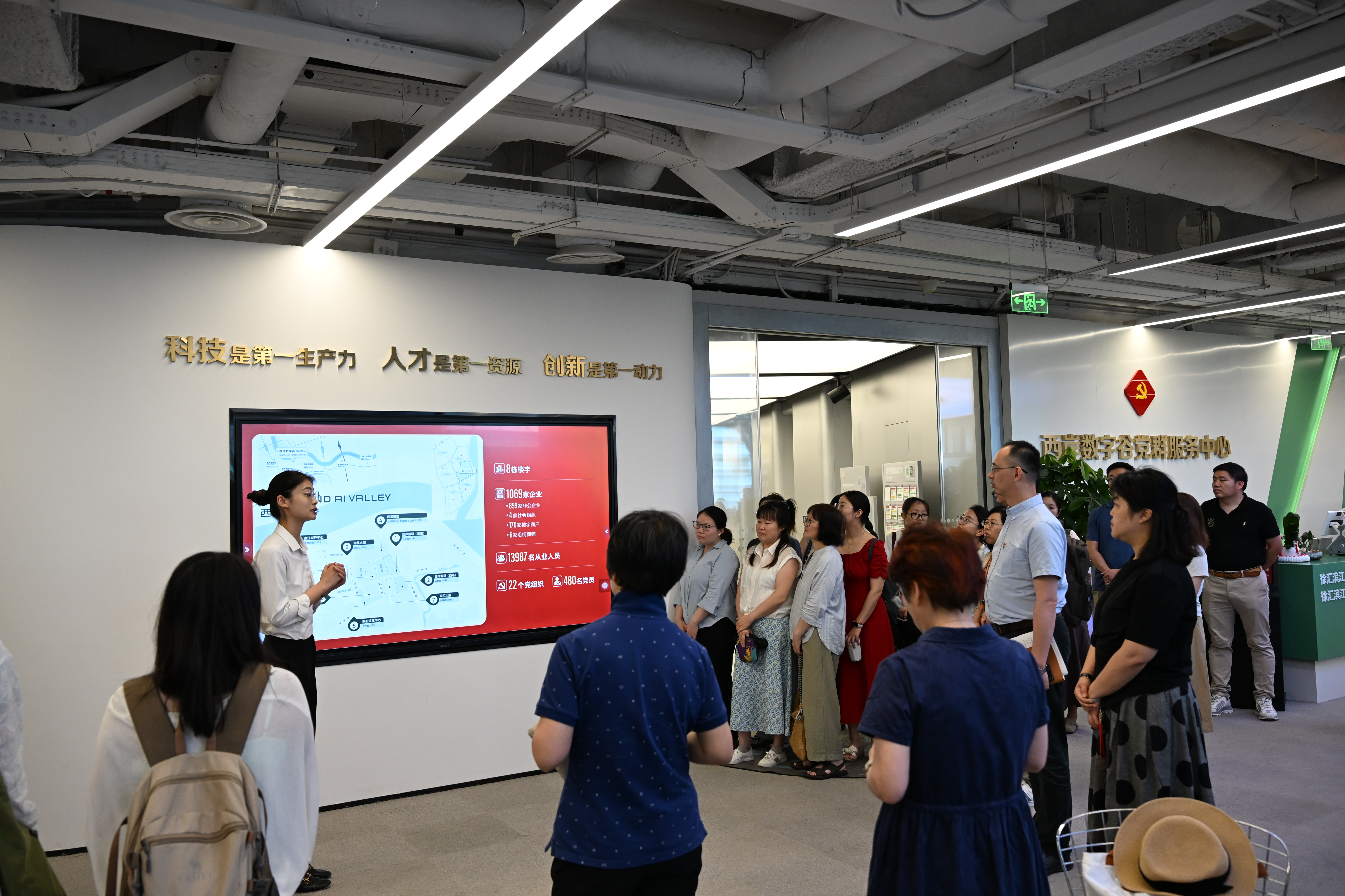 6月30日,yl23411永利集团官网教师党员走进徐汇西岸党群服务中心开展主题党日活动。西岸党群服务中心作为党建引领社会治理的前沿阵地,以丰富的党建文化展示和创新服务形式,为党员们提供了沉浸式的学习场景。在专业讲解员的带领下,教师党员参观了服务中心的各个区域。服务中心内丰富的党建文化展示、先进的服务设施以及贴心的为民服务理念,让党员们对党群服务工作的内涵和意义有了更深刻的理解。参观过程中,老师们认真聆听讲解,不时交流心得,气氛热烈而庄重。