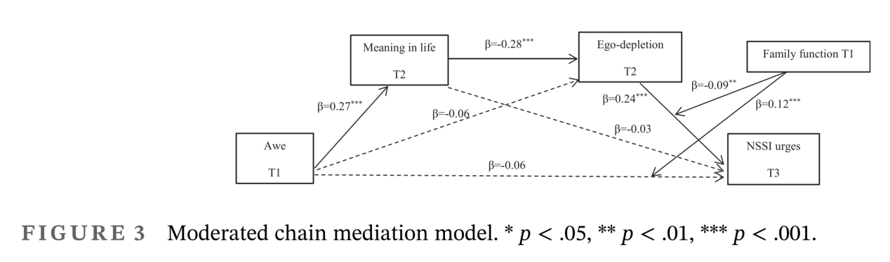 研究共招募了969名青少年,在三个时间点进行施测。结果发现,敬畏通过增加生命意义感进而降低自我损耗间接影响自伤冲动。加入家庭功能后,结果表明家庭功能调节了直接路径和链式中介模型的后半部分。