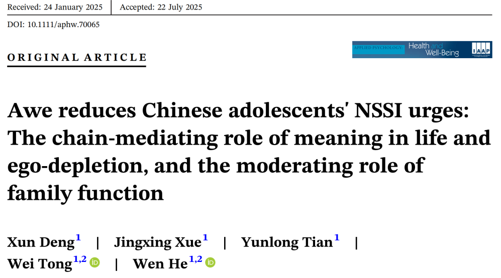 Deng, X., Xue, J., Tian, Y., Tong, W., & He, W. (2025). Awe reduces Chinese adolescents’ NSSI urges: The chain-mediating role of meaning in life and ego-depletion, and the moderating role of family function. Applied Psychology: Health and Well-Being, 17(4), e70065.