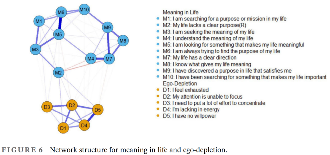 网络分析揭示了生命意义感与自我损耗间的两个关键关联因素(“我的生活缺乏明确的目标”以及“我需要付出大量努力才能集中精力”)。