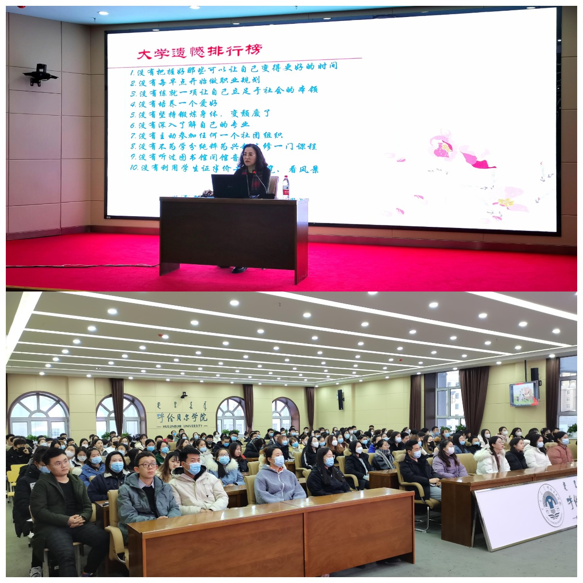 讲座伊始,李雪峰院长以“上大学意味着什么”带领同学们回顾校园生活点滴,每个精彩瞬间仿佛再次浮现在大家眼前,历历在目,李雪峰院长送给在场同学们一句话“春风十里,不如呼院有你”,希望同学们在毕业之后,经常回母校看看。接着,李雪峰院长给同学们播放一段Beat365中文官方网站2016级学生制作的毕业视频,并告诉同学们要活在当下,现在不努力,将来就要奔跑,还展示“大学遗憾排行榜”,警醒同学们从现在开始撰写毕业论文,大学里有资源丰富的图书馆,有答疑解惑的老师,现在是写毕业论文最好的时间。紧接着,李雪峰院长和同学们讨论如何看待毕业和就业。李雪峰院长提出,现在就业的大问题是“慢就业、懒就业,”她告诫同学们,毕业之后不一定能找到最喜欢的工作,主要是要找到适合自己的工作,同时也提醒同学们,远离诈骗,远离就业培训贷。最后,李雪峰院长给予同学们寄语:未来,你必须面对的是继续成长,并走向独立。站在山脚,永远不知道山顶的风景。因为成长,要保持良好的习惯,不让芯片取代灵魂,莫让浮云遮蔽双眼。