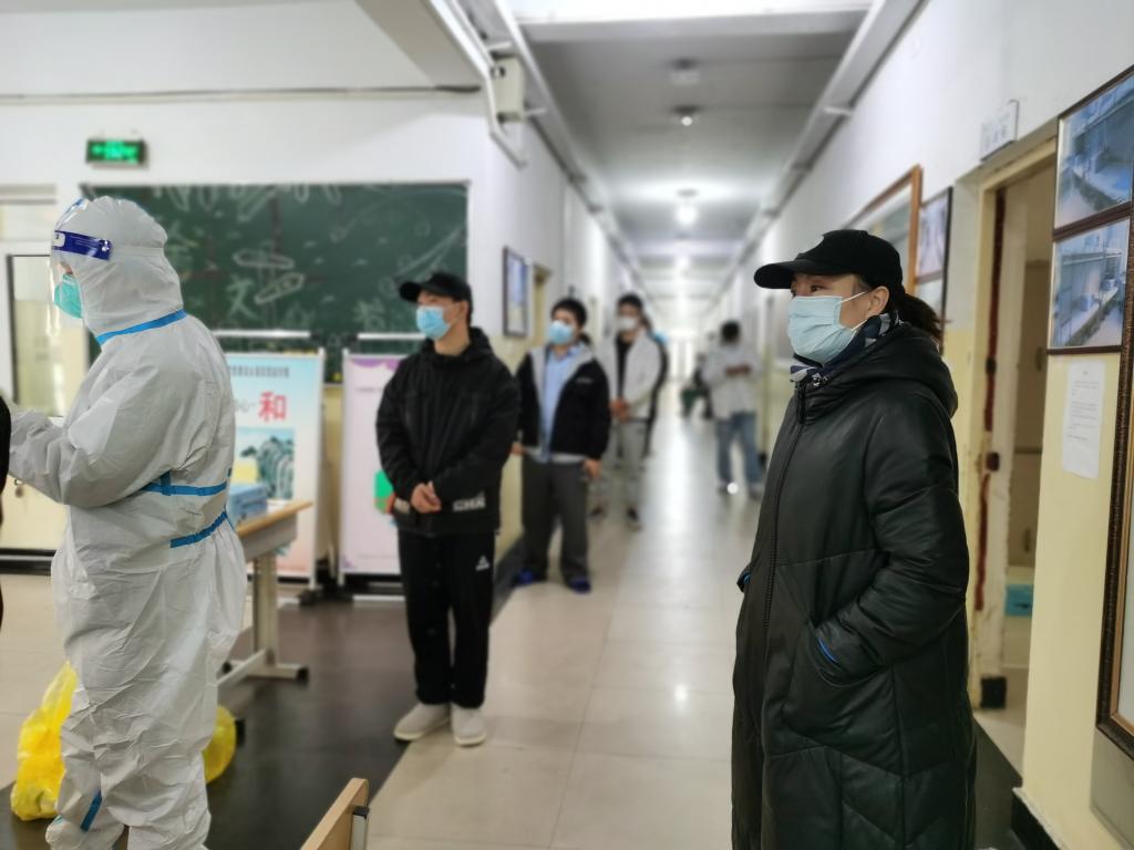 在十几天的默默坚守中,几名党员教师初心如磐,每天工作10余小时,白天组织学生进行核酸检测、餐食发放、宿舍管理、学生情绪疏导等工作,天没亮时就已经开始组织各宿舍进行核酸检测的准备工作,核对信息,维持秩序,落实一米间隔,引导学生有序检测。夜间还需要进行数据的收集统计、布置第二天工作。高强度的工作令几位教师疲惫不堪,但每一位同志都积极主动,克服困难,主动承担更难更繁杂工作,顺利协助完成每天的核酸检测工作。