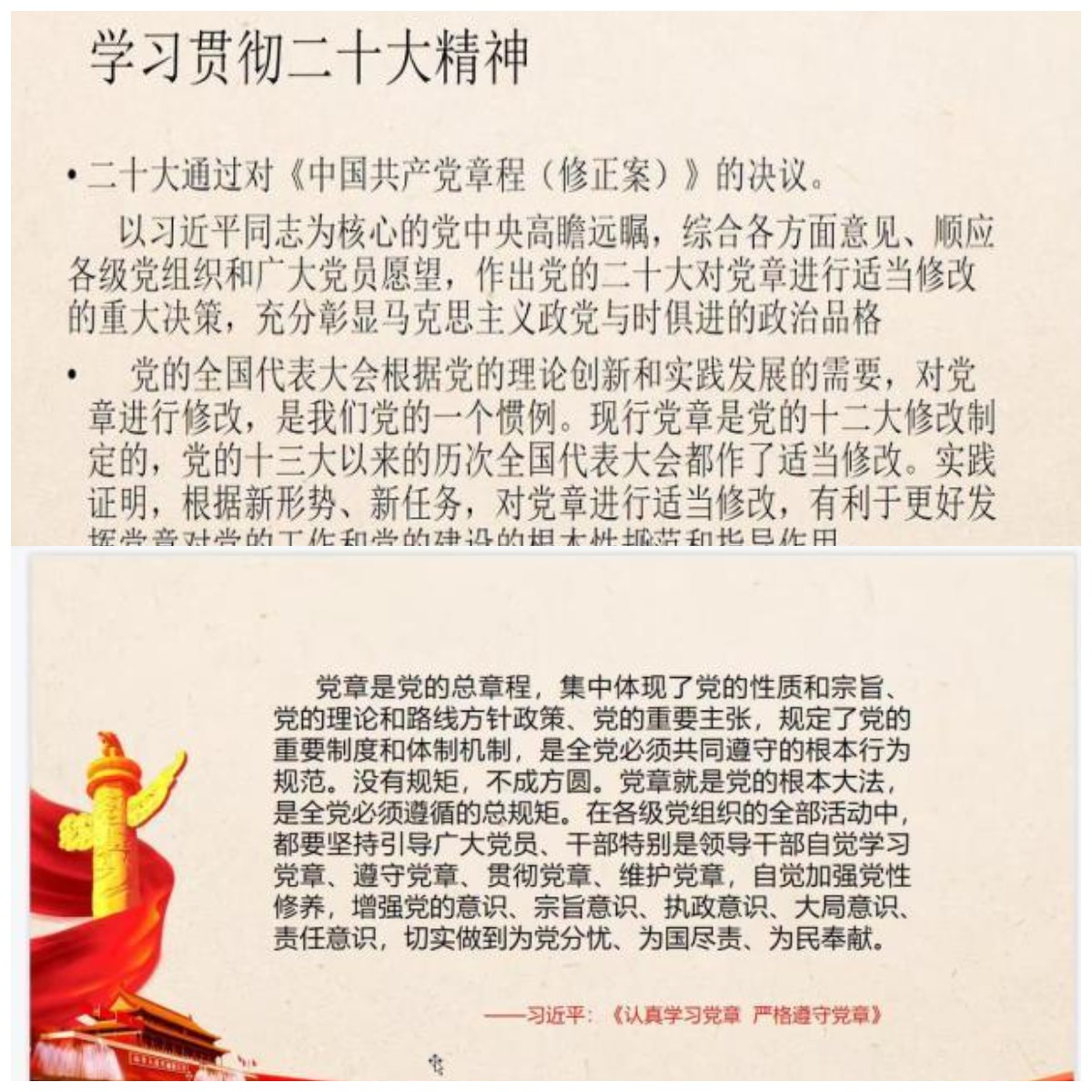 紧接着,李静书记为大家讲解《中国共产党章程》建设历程,使学生党员明白了党章是党的总章程,集中体现了党的性质和宗旨、党的理论和路线方针政策、党的重要主张。更加加深了学生党员们对党的了解,使其更加坚定了成为一名合格党员的决心。同时,学生党员们发现自身还有很多不足之处,今后应该加强自身修养,学习党的最新思想,关注党的最新动向,早日成为一名合格的共产党员,为人民服务!