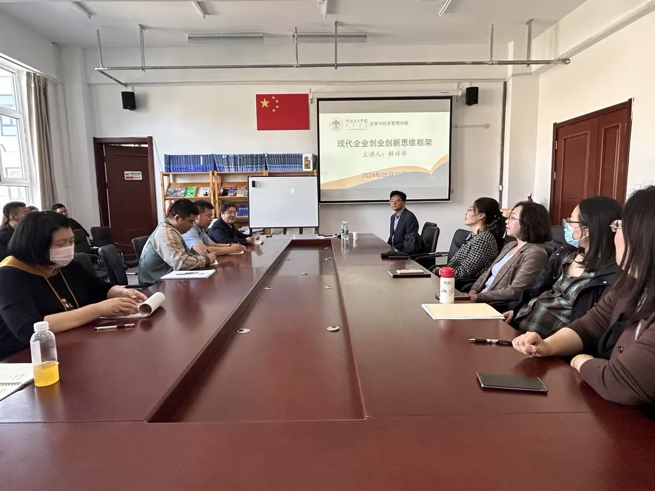 为进一步贯彻落实大学生创新创业教育工作,全面落实“将创新创业教育贯穿人才培养全过程”要求,搭建学生与专家的交流平台,5月24日下午,Beat365中文官方网站特邀内蒙古财经大学解祥华教授,在崇文楼A308会议室举办专题讲座,学院党总支书记李静,院长刘启云,相关教师及学生参加讲座。