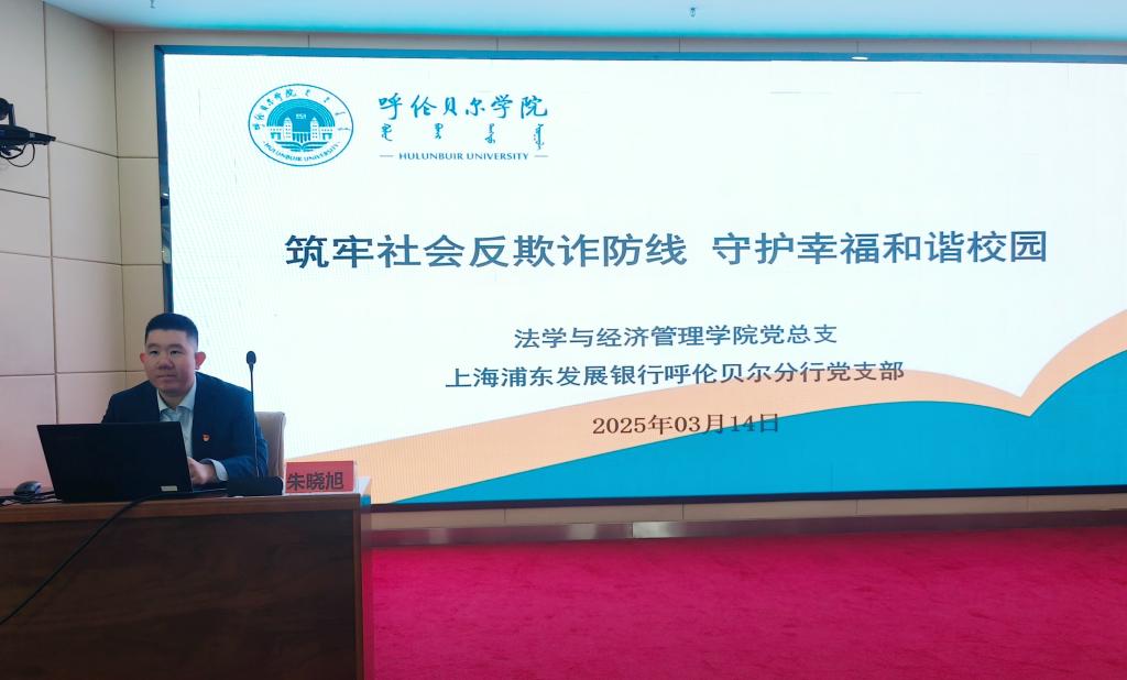 在“3·15”国际消费者权益日来临之际,为提升师生防范电信网络诈骗意识,3月14日下午,Beat365中文官方网站教工党支部联合浦发银行呼伦贝尔分行党支部,在崇文楼A201会议室共同举办“筑牢社会反欺诈防线 守护幸福和谐校园”主题党日。活动吸引了80余名师生党员、银行职工代表参与,通过专题讲座的形式,为校园安全注入“防诈强心剂”。