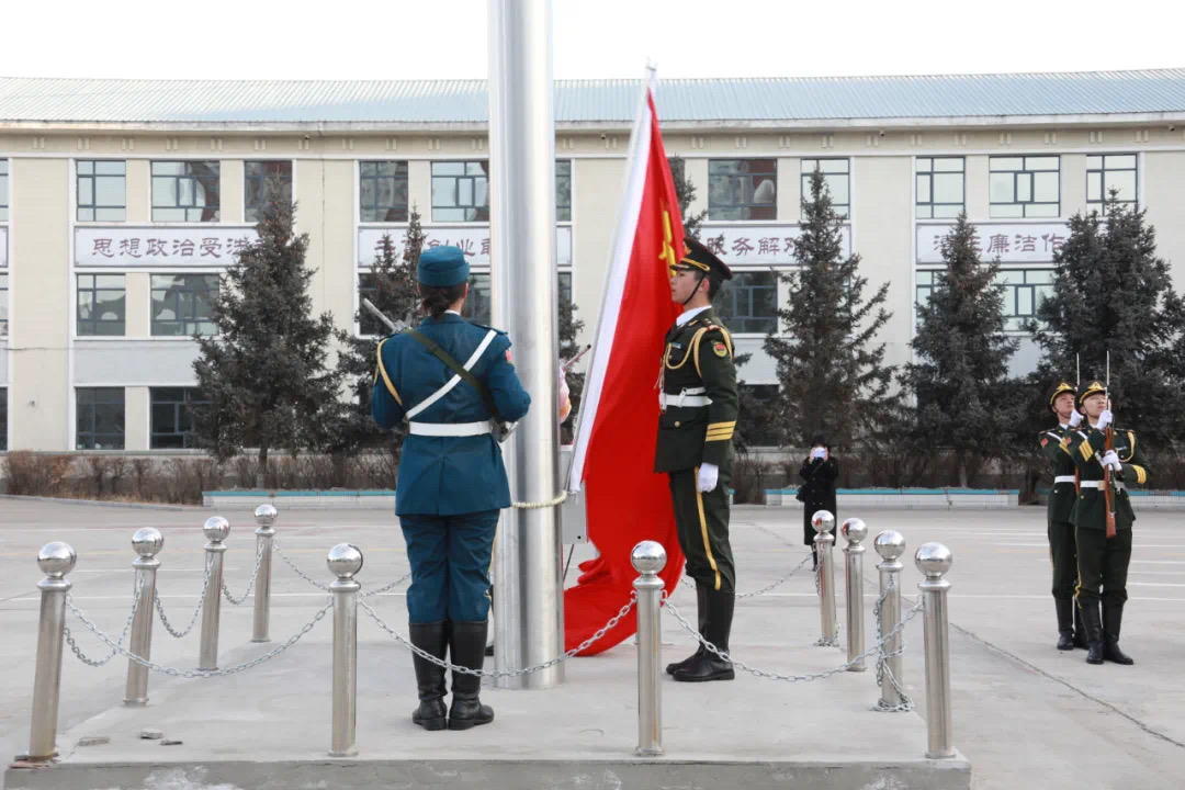 鲜艳的五星红旗随着庄严嘹亮的《义勇军进行曲》缓缓升起,五星红旗随风飘扬,在场师生脱帽行注目礼,共同唱响国歌。浓浓的爱国热情,激荡在每一个人的胸怀。