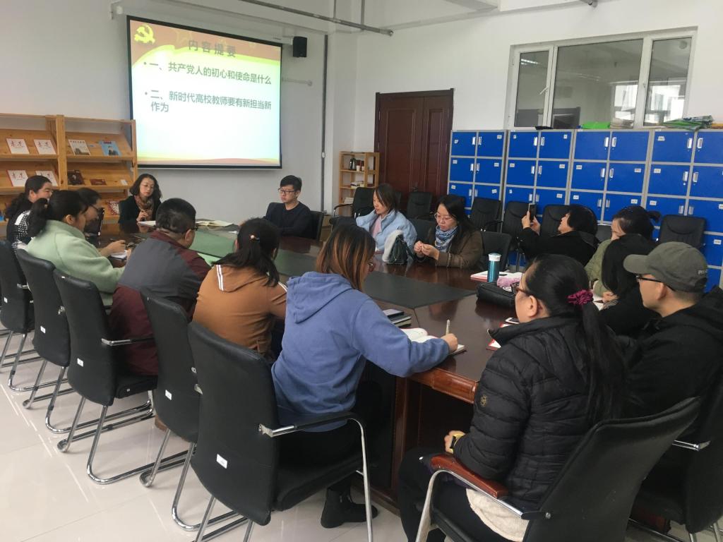 刘院长,首先分享了关于什么是初心这个主题,告诉党员们“中国共产党人的初心和使命,就是为中国人民谋幸福,为中华民族谋复兴!这个初心和使命是激励中国共产党人不断前进的根本动力。”其次,通过视频带大家回顾了中国共产党的发展史,通过陈能宽、万里等先进人物的事迹激发党员的服务意识和带头意识,引导党员在日常工作中更好的发挥先锋模范作用。最后,强调了新时代高校教师要有新担当新作为,要开动“脑子”、做好“样子”、强壮“身子”、挑好“担子”、找准“路子”,坚持做到“守教育报国初心,担立德树人使命”。